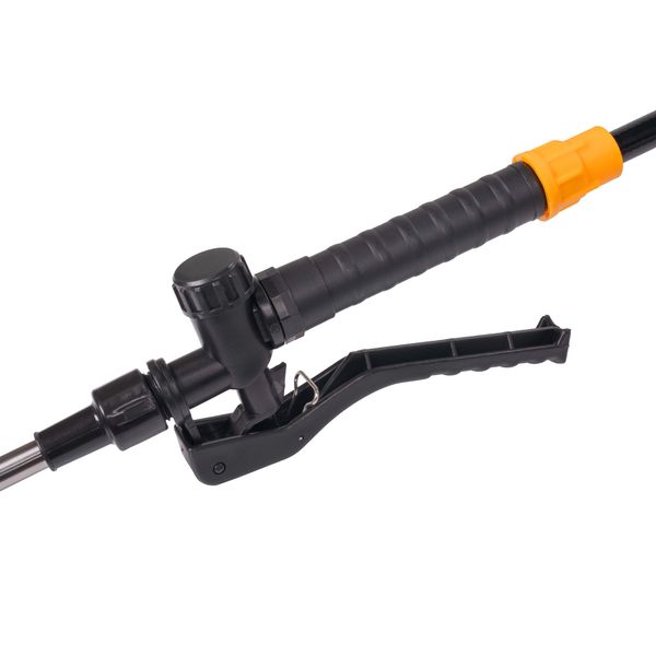 Användning: Vid första användning rekommenderas det att du testar trycksprutans funktion med enbart vatten. Efter det öppnar du tanklocket och tillsätter önskat rengöringsmedel. Stäng locket och starta trycket genom att ställa strömbrytaren till I-läget. Trycket kan justeras från reglaget som finns bredvid strömbrytaren. För applicering av medel trycker du på avtryckaren som sitter på handtaget till botten och släpper avtryckaren för att avsluta appliceringen.