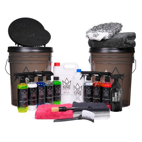 Ett komplett King Carthur bilvårdspaket för att tvätta och skydda bilens exteriör, glasytor, motorutrymme och interiör. Förutom en mängd rengöringsmedel innehåller paketet även tillbehör för rengöring, allt ingår!
