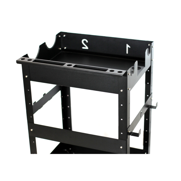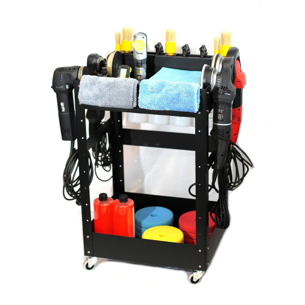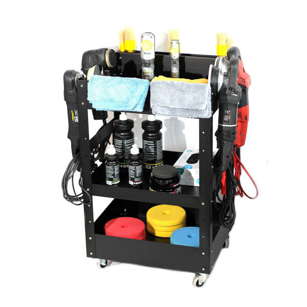 Mycket robust och praktisk bilvårdsvagn med två eller tre hyllplan. Utrymme för sprayflaskor, borstar, polermaskiner, rengöringsmedel etc.