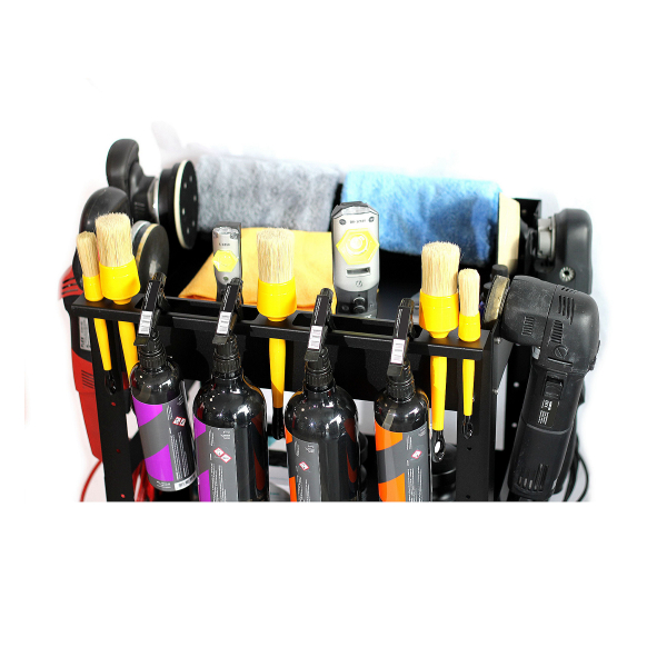 Beroende på modell har vagnen två eller tre hyllplan, hängplatser för upp till fyra polermaskiner, separata hängplatser för sprayflaskor och penslar samt bra hyllutrymme för flaskor, trasor och andra tillbehör. Poka Premium Detailing Trolley underlättar arbetet och blir snabbt ett populärt hjälpmedel både i verkstaden och för den erfarne bilvårdaren!