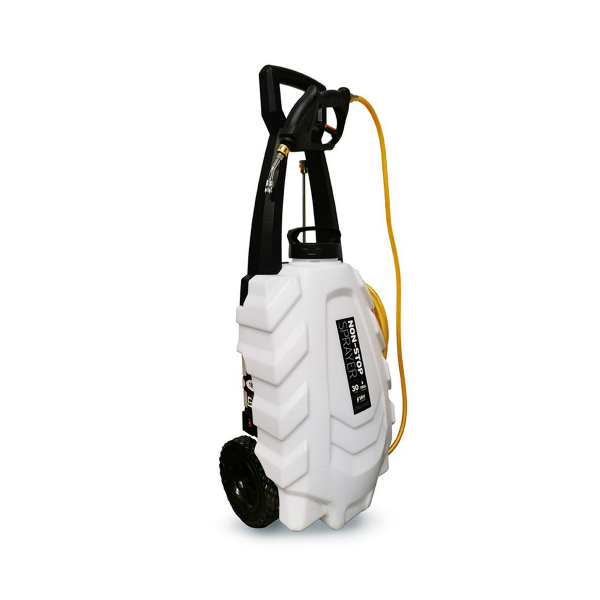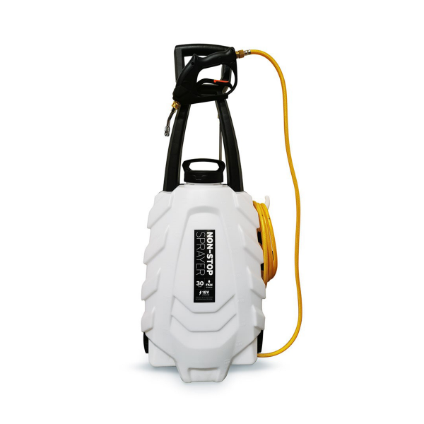 Non-stop Sprayer är ett mycket smidigt verktyg för att enkelt och effektivt applicera kem på bilen. Med en behållare med en kapacitet på 30L så lämpar den sig perfekt för tvätt av många fordon på kort tid eller för tvätt av större fordon. Den stora kapaciteten gör att man sparar in mycket tid på att konstant behöva fylla på medel. Tack vare att den är elektrisk så behövs det ingen luft inutik själva kärlet, detta gör att man kan fylla hela med kem utan att sprayfunktionen försämras. Högkvalitativ FKM-packning vilket gör att den tål många olika slags kem, inklusive kallavfettning. Drivs med 18V batteri av "skruvdragar"-format. Kan spraya konstant i ca 2 timmar innan den måste laddas.