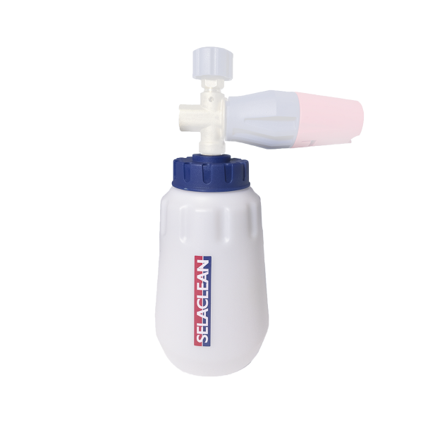 Selaclean Foam Lance reservflaska, högkvalitativ och stadig skumlansbehållare. Behållaren för vätska är tillverkad i högkvalitativ HDPE-plast och har praktiska skåror längst upp på korken som gör att du får ett bättre grepp när du fyller på medel. Dessutom har behållaren en tydlig måttskala som underlättar doseringen.