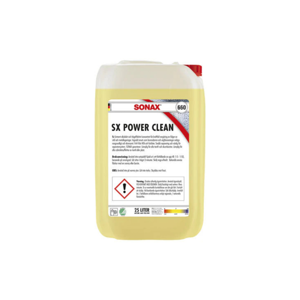 SONAX Power Clean Ecoline är en alkalisk avfettning som används vid förtvätten. Den är färdigutspätt och redo att användas direkt ur flaskan. Power Clean löser organisk smuts från naturen samt olja, fett, sot m.m. Medlet är fritt från petroleum och har en mycket bra rengöringsförmåga samtidigt som det är skonsamt mot plats, gummi och aluminium.