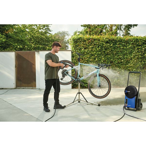 Med sin robusta struktur och låga tyngdpunkt håller högtryckstvätten sig upprätt, även på ojämna ytor. Den 10 meter långa, stålförstärkta tryckslangen är flexibel vilket förhindrar att slangen vrids och slår knut på sig själv. Högtryckstvätten sitter monterad på en smidig transportvagn för enkel transport och förvaring. I standardutrustningen ingår även ett helt nytt spolhandtag, 4 munstycken, en skumkanon och en integrerad slangvinda. Den lättanvända Click&Clean snabbkopplingen tillåter en att snabbt växla mellan olika tillbehör.
