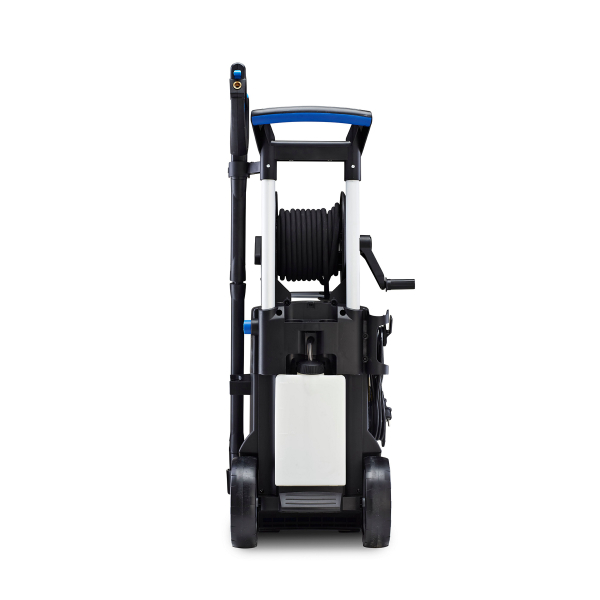 Den mycket flexibla stålarmerade högtrycksslangen är hela 12 meter lång och utrustad med en skruvkoppling för en enkel anslutning. Dessutom med en integrerad slangvinda vilket underlättar både användning och förvaring av högtryckstvätten. Tack vare sin robusta konstruktion och låga tyngdpunkt är den stabil vid användning. Vidare så är högtryckstvätten utrustad med ett mycket praktiskt teleskophandtag.