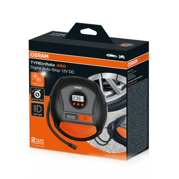 Osram TYREinflate 450 är en mycket smidig kompressor som drivs direkt via bilens cigarettuttag och används för att fylla på luft i däcken. Att ha rätt däcktryck är mycket viktigt, både ur ett säkerhetsmässigt och ekonomiskt perspektiv. Däck utan tillräckligt lufttryck ökar bilens förbrukning och försvagar däcken. Dessutom slits däcken snabbare, vilket ökar kostnaderna för dig som bilägare.