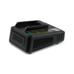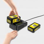 Snabbladdare för Kärchers 18V-batterier, utrustad med intelligent laddningsteknik, integrerat överladdningsskydd och LED-indikator. Ett 18V/2,5 Ah-batteri laddas till 80% på endast 44 minuter!