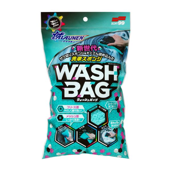 Soft99 Alaunen Wash Bag är en dubbelsidig tvättsvamp med en sida av mjuk och skonsam fleece, och den andra av slitstarkt nätmaterial. Fleecesidan är idealisk för rengöring av lackerade ytor, de långa, mjuka trådarna följer bilens former och suger effektivt upp smutspartiklar in i kudden. På så sätt undviks att grus och smuts gnuggas mot lacken. Den motsatta sidan av tvättkudden är täckt av nätväv, perfekt för att lossa ingrodd smuts som insektsrester och fågelspillning utan att du behöver skrubba hårt.