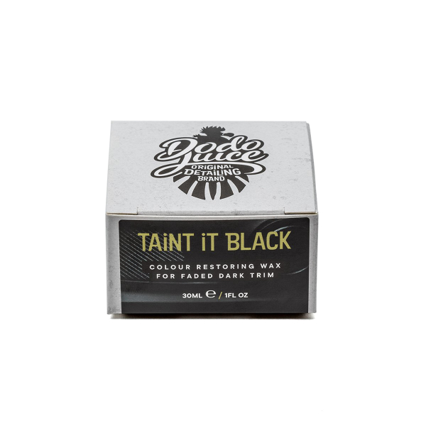 Dodo Juice Taint it Black är en plast- och gummibehandling i vaxform som både ger ett långvarigt skydd och återställer den ursprungliga svarta färgen på ytor av plast och gummi. Taint it Black skapar en tunn osynlig hinna på den behandlade ytan som effektivt stöter bort vatten och smuts och gör det mycket enklare att hålla ytorna rena. Den glansgrad som Taint it Black lämnar är så kallad satin, vilket innebär att den varken är blank eller helt matt, utan någonstans mittemellan. Lämplig för behandling av däck såväl som för att skydda nya och redan blekta plastdelar.