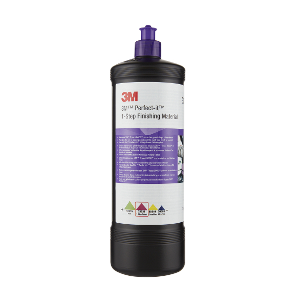3M "Lila Kork" Perfect-It 1-Step Finishing är ett mångsidigt, lätt slipande polermedel avsedd för finish. Polermedlet avlägsnar små repor och andra defekter i lacken och lämnar en mycket blank, skinande yta. Enkel och smidig att använda, med ett synligt resultat på en gång. Den fuktiga, lite "feta" kompositionen möjliggör en något längre körtid som i vissa fall kan behövas för att förbättra resultatet, särskilt på känsliga ytor. Lätt att torka av efter polering.