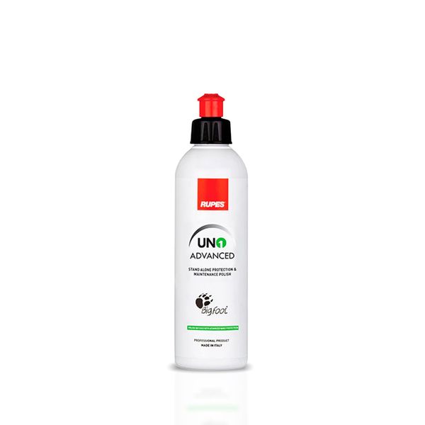Rupes UNO Advanced är ett allt-i-ett-polermedel som tar bort små repor, polerar och även bildar ett hållbart och avvisande skyddande lager på den behandlade ytan. UNO Advanced använder den senaste tekniken och dess kraft är baserad på kombinationen av finfördelade slippartiklar och keramiskt skydd. Medlet avslutar ytan felfritt och lämnar den underbart glänsande och hal samtidigt som den erbjuder ett skydd som varar upp till 12 månader, med utmärkta smuts- och vattenavvisande förmågor samt ett motstånd mot väder och kemikalier. För en lackyta i relativt gott skick lämpar sig medlet för användning i befintligt skick och för bearbetning av en yta i sämre skick lämpar det sig för efterbehandling efter en grövre kombination av medel och trissa. UNO Advanced är ett utmärkt val för till exempel bilverkstäder, för med detta medel kan lackytan på en bil i måttligt skick repareras snabbt med färre arbetsmoment och medel. Lämplig för användning med alla typer av polermaskiner.