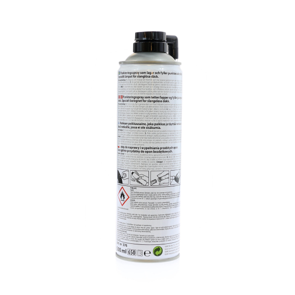 Avlägsna om möjligt det föremål som har orsakat punkteringen och släpp ut kvarvarande luft. Skaka burken kraftigt före användning. Skruva fast anslutningen på däckventilen och håll burken upprätt. Töm hela innehållet i däcket och kör 5-10 km med max 60 km/h så att innehållet fördelas jämnt i däcket. Kontrollera däcktrycket så snart som möjligt och fyll på vid behov.