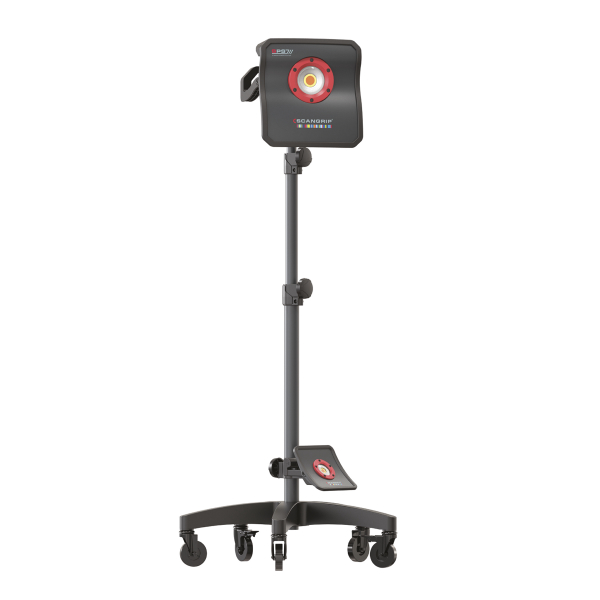 Stadigt och praktiskt stativ med hjul, för att fästa Scangrip arbetsbelysning. Justerbar höjd från 0,9 meter upp till 1,9 meter! Två platser för lampor, för att skapa belysning både uppifrån och underifrån.