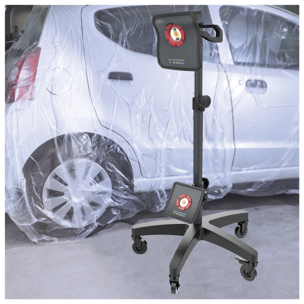 Scangrip Wheel Stand är ett högkvalitativt stativ med hjul, för Scangrips arbetsbelysning. Stativets höjd är justerbar från 0,9 meter upp till 1,9 meter. Det ökar flexibiliteten och arbetskomforten, eftersom arbetslampan kan ställas in i önskad höjd och vinkel, och lamporna behöver inte hållas obekvämt på golvet, i händerna eller på annan yta. Tack vare hjulen är det dessutom enkelt att flytta stativet, till exempel runt en bil under ett poleringsarbete. Hjulen är robusta och rullar bra även på ojämna ytor. Två av hjulen kan låsas för att säkerställa ett fast läge. Scangrip Wheel Stand är tillverkat av starkt pulverlackerat stål, vilket säkerställer hållbarhet även vid hårt arbete. Lamporna som visas på bilderna ingår inte i leveransen.