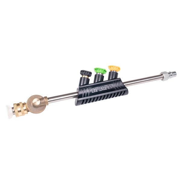 Högtryckslansen (Dr Dirt Magic Wand G3) är ett avancerat tillbehör som kan ersätta högtryckstvättens originallans. Magic Wand är ingen traditionell spollans, utan fungerar med utbytbara munstycken och har dessutom en spolvinkel som kan justeras. Högtryckslansen är försedd med ett gummihandtag, vilket gör användningen mer bekväm. Från de fyra olika munstyckena garanteras en spolbild som passar just dig och ditt ändamål. Munstyckena placeras nära till hands på det gummerade hantaget för enkelt byte av spolbild och smidig förvaring. Alla munstycken monteras enkelt av och på med snabbkopplingen, så byte av munstycke sker enkelt och snabbt. Toppen av högtryckstvätten är riktbar, så spolvinkeln kan bekvämt justeras 90° åt båda hållen, denna funktion gör att avspolning även på svåra platser är extremt enkelt och effektivt!