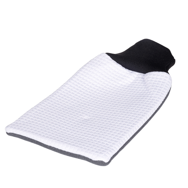 CAR5 Glass Mitt är en tvätthandske speciellt avsedd för glasytor med dubbelsidig funktion. Den dubbelsidiga funktionen möjliggör både en felfri rengöring och en kristallklar finish. Den gråa sidan av handsken har en mycket tät och korthårig mikrofiber som utan problem tar bort även svår smuts, såsom rester av nikotin, insekter och annan smuts från från glasytor. Den vita sidan är avsedd för en efterbehandling, då den våffelmönstrade mikrofiberstrukturen gör att det lämnas en yta som är kristallklar, helt utan ränder. Tanken med handsken är att glaset ska rengöras i två steg: först genomförs en rengöring med den grå sidan av handsken, därefter vänder man på handsken till den vita sidan, som lämnar en felfri finish. Tack vare handskens välplanerade storlek och design är det lätt att rengöra ytor som i vanliga fall kan vara lite svåra att komma åt, exempelvis insidan av framrutan. Tvätthandsken är avsedd för en rengöring tillsammans med en glasrengöring, till exempel CAR5 Glass Cleaner.
