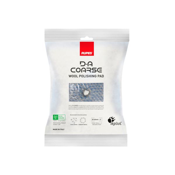 Rupes DA Coarse Wool är en grovt slipande ulltrissa designad för oscillerande maskiner, lämplig för att ta bort djupa repor. Coarse Wool Pad är en uppdaterad version av tillverkarens populära Coarse Wool Pad. Med sin uppdateringen har baksidan av trissan nu fått ännu tätare och kraftigare skum, vilket gör trissan mer effektiv vid avverkning än tidigare. Liksom sin föregångare använder DA Coarse Wool två typer av längder på ullfibrerna för att kunna ta bort djupa repor. Ulltrissan tar även bort slipmärken från P1500 sandpapper.