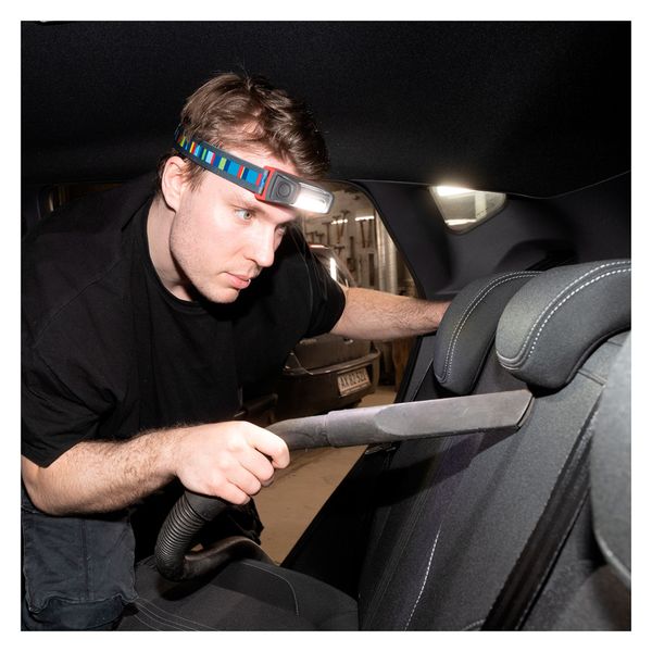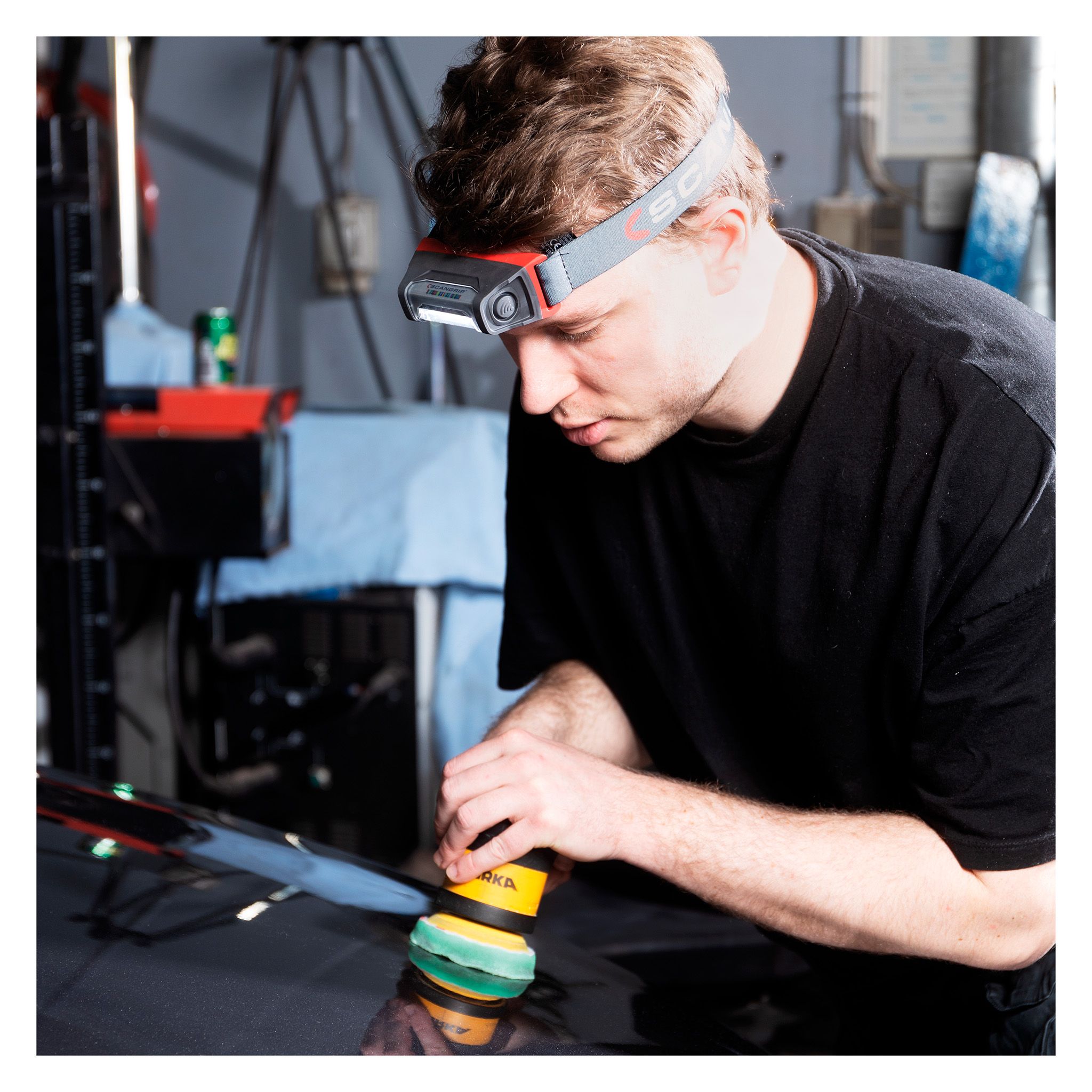 Uppladdningsbar pannlampa med högt färgåtergivningsindex (CRI+ 96) med 5-stegs färgtemperaturjustering och en praktisk dimningsfunktion. Särskilt lämplig för polering, lackering och annat detaljarbete. Specificerat maximalt ljusflöde 250 lumen.