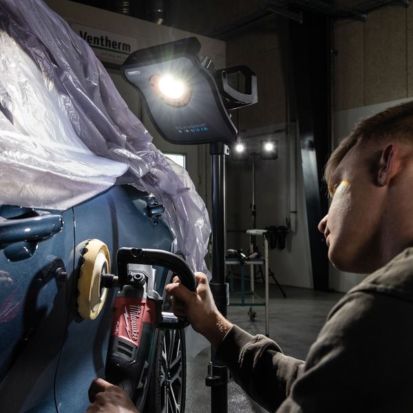 Undersökningslampa med bred ljusbild, designad för inspektion av lackytor och andra detaljarbeten. Drivs med de vanligaste 18-20V verktygsbatterierna. Justerbart ljusflöde och färgtemperatur, deklarerat maximalt ljusflöde på 3000 lm. Färgåtergivningsindex (CRI) upp till >96.