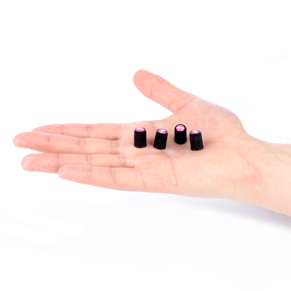 Ventilhattar med Autodude-logga i 4-pack för alla ventiler på din bil. Hattarna är gjorda av stryktålig, svart hårdplast med en rosa Autodude-logga.